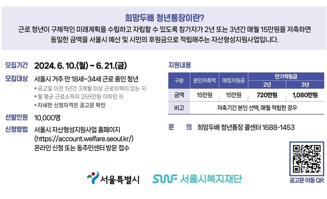 지금까지 2024 희망두배 청년통장 신청방법, 제출서류, 그리고 Q&A 사항까지 함께 알아보았습니다! 납입한 만큼 서울시에서 동일 금액 납입해 주는 만큼 6월 21일 오후 6시까지 신청 기한 기억하셔서 목돈 저축의 기회 놓치지 마세요!