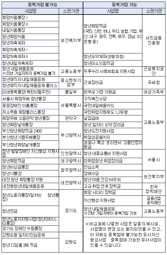 다른 지원 사업에 참여하셨어도 중복으로 가입이 가능한 경우가 있습니다. 가능한 상품과 불가능한 상품을 나누어 두었으니 살펴보시고 최대 저축 지원 혜택을 누려 보세요!