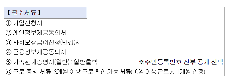 - 본인 근로소득 세전 월평균 255만원 이하, 부양의무자 소득 연 1억 미만, 재산 9억 미만